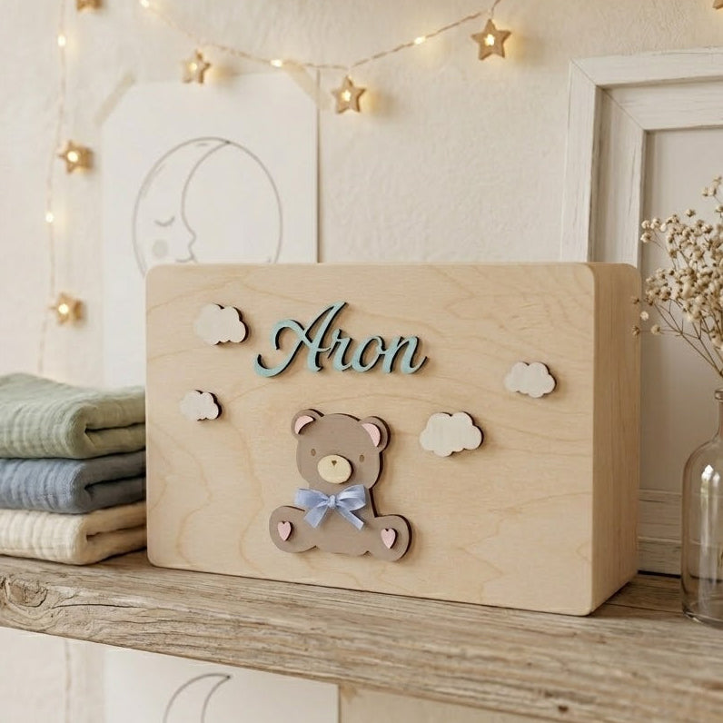 Il tempo vola, ma i ricordi restano. La nostra Memory Box in legno naturale è lo scrigno perfetto per conservare i momenti più dolci e significativi della crescita del tuo bambino: dal primo completino al braccialetto della nascita, fino ai piccoli tesori che segnano i suoi primi passi nel mondo.