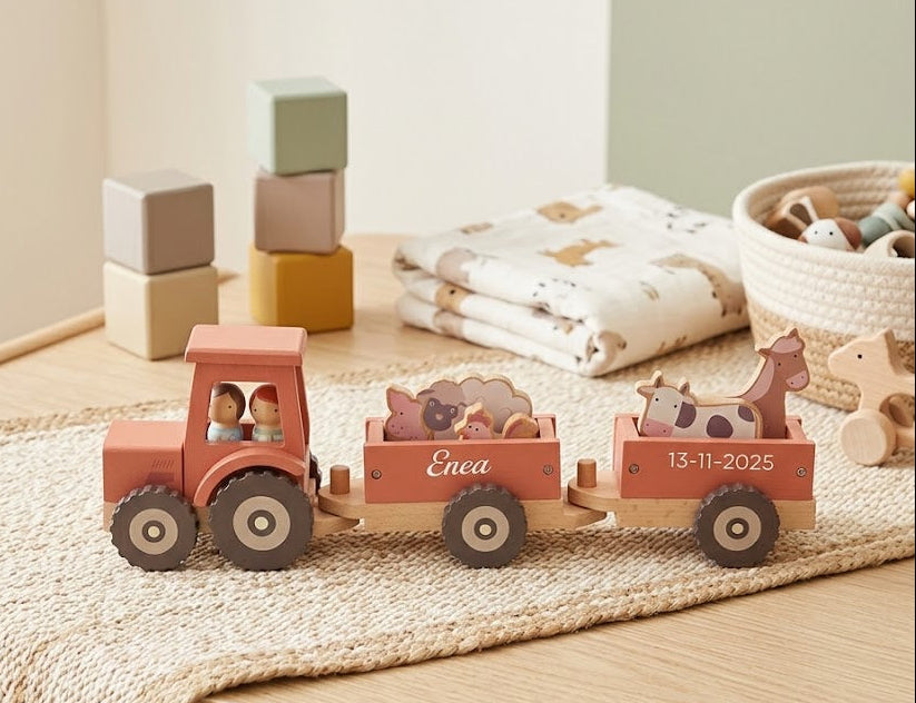 Questo trattore in legno personalizzato con nome e data di nascita del bambino è il dono perfetto: unico, significativo e destinato a diventare un ricordo prezioso che crescerà insieme al piccolo!