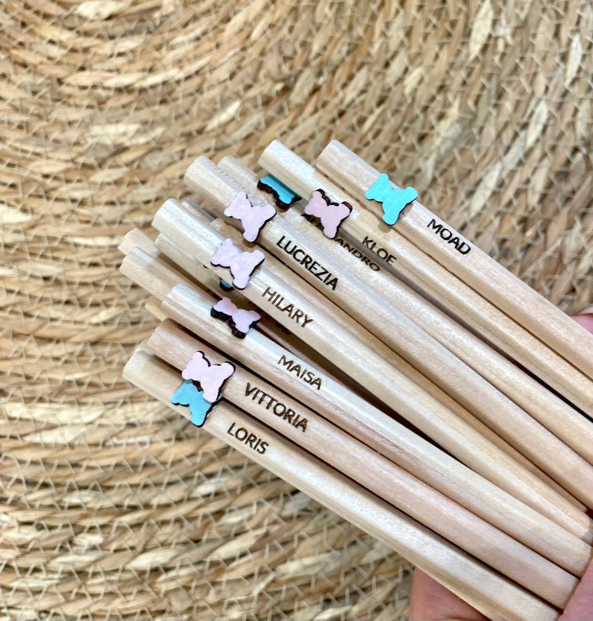 Queste matite in legno con dolci orsetti rosa e azzurri sono perfette per rendere ogni occasione speciale. Si personalizzano con l'incisione laser del nome del bambino, creando un tocco unico e personale. Ideali come regalo di compleanno o come segnaposto originale per feste, uniscono utilità e ricordo prezioso. Regalate un dettaglio speciale che resterà nel cuore di grandi e piccini.